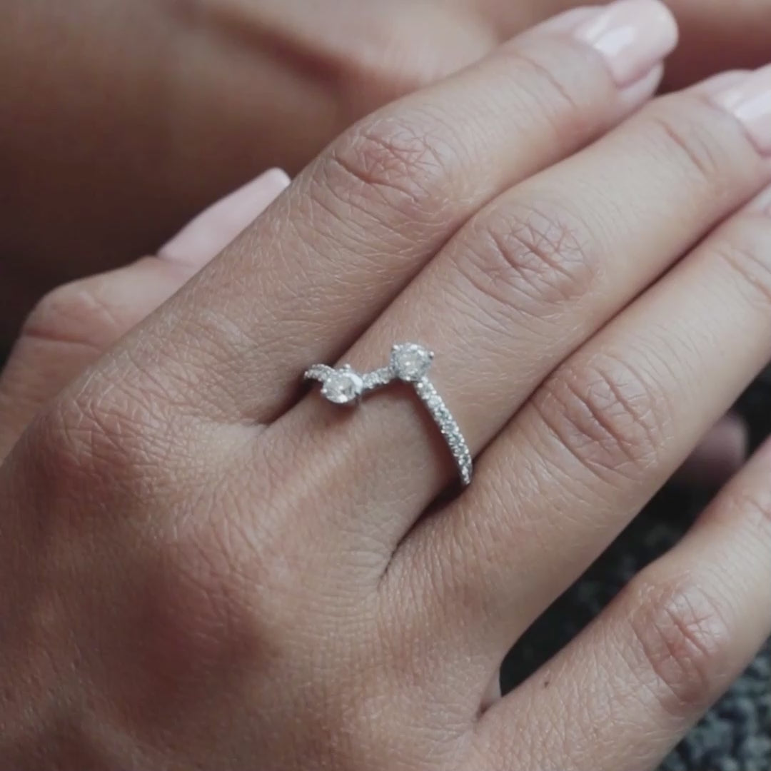 A celebration of the power of two, this unique handcrafted ring features sparkling rocks engaging in a sensual dance. The perfect way to mark a love union, it features two round-cut lab-grown diamonds, which are set upon a paved 18K recycled white gold base.