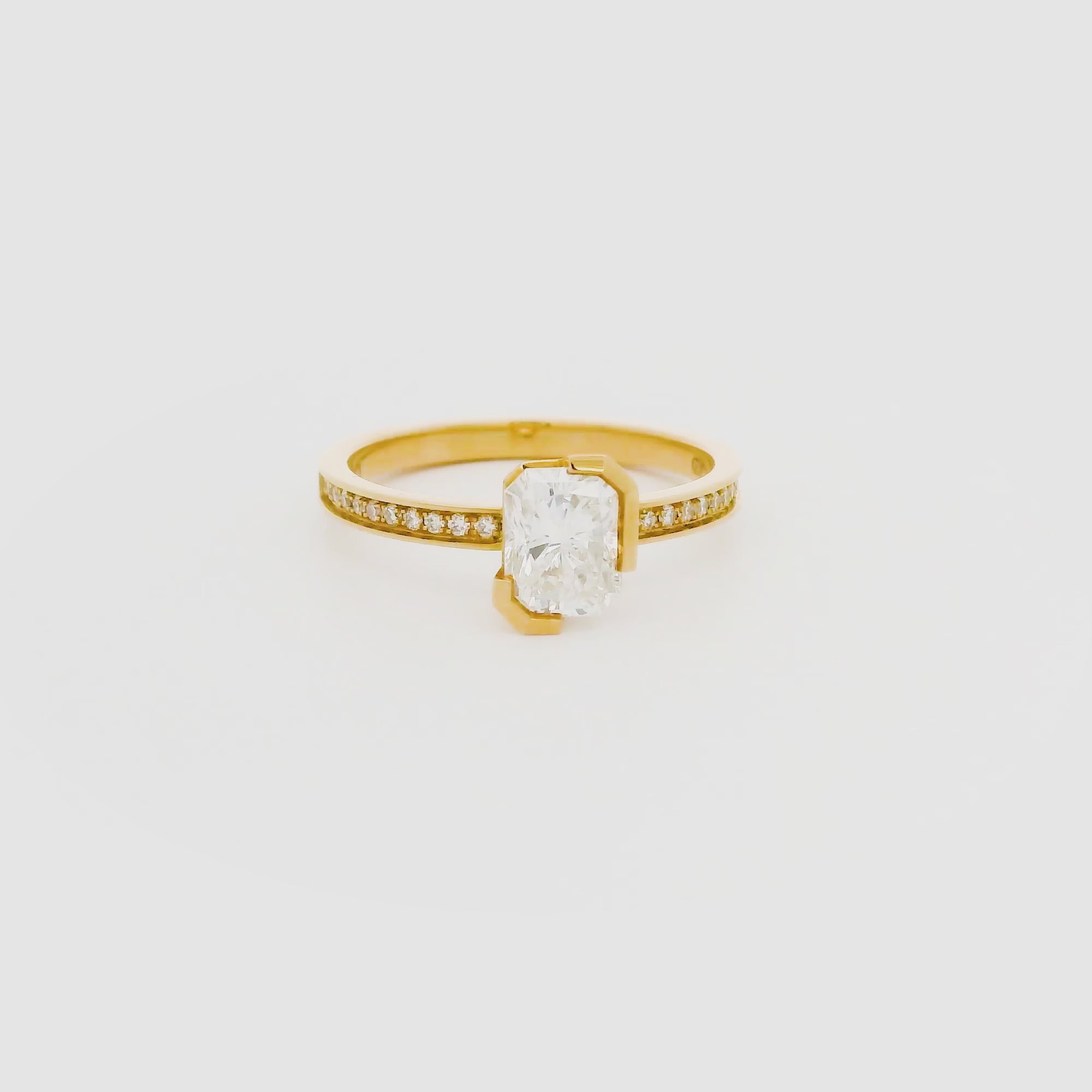 The Meta Iris Pavé Ring is a jewel with delicate curves that celebrates the great milestones of life. This solitaire is characterized by a radiant cut lab-grown diamond, created from renewable energy. It is highlighted by a delicate paving that goes up to the top.