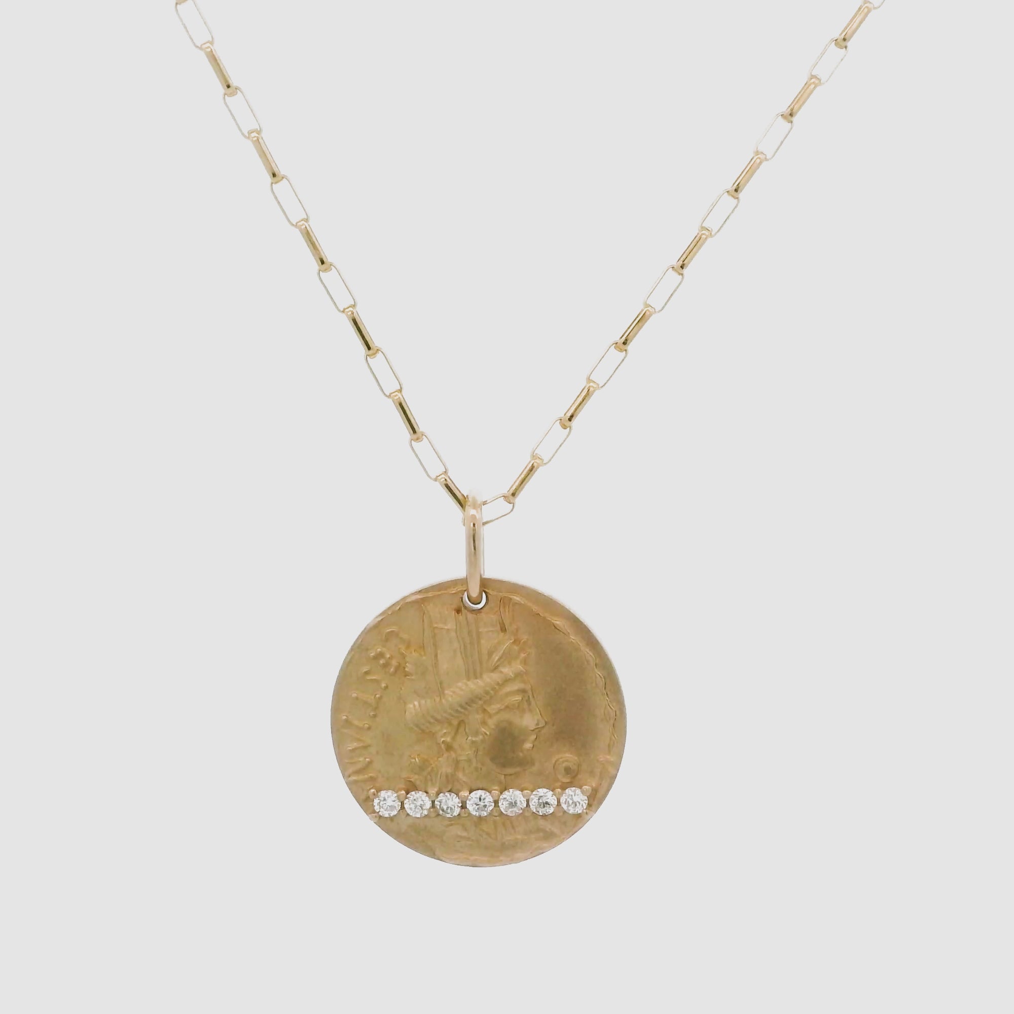 A K10 coin charm depicting the earth goddess, Cybele. The lavishly arranged diamonds represent the horizon of the "earth". Cybele was the goddess of fertility and abundance, and the embodiment of the fertility of the earth. She is also the protector of knowledge, so she is perfect for those who want to have an intelligent and generous heart.