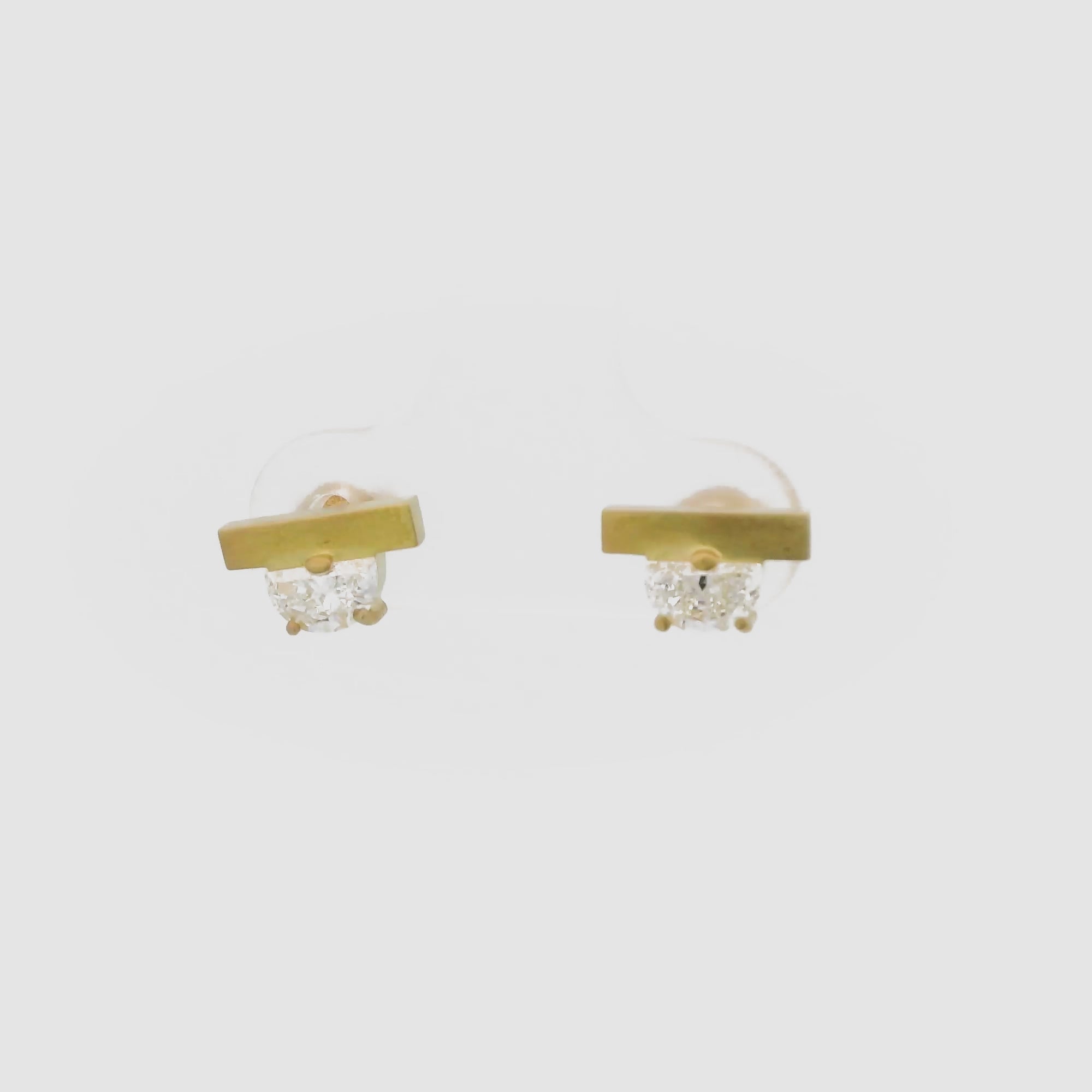 These simple and contemporary earrings feature a half-moon cut diamond of approximately 0.2 carats, one on each side, which is characterized by its silhouette cut resembling a half moon. The small but unique cut diamonds make for an impressive look.