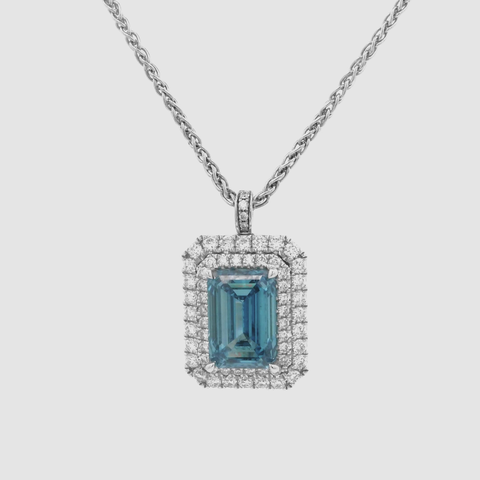 Wonder Rocks showcase IGI-certified color lab-grown diamonds in Emerald cut—encircled by a dazzling pavé of white lab-grown diamonds. This exquisite collection is designed for versatility, not only are the color of the 3ct stones customisable, but each set also comes with an 18K white gold chain and an 18K white gold ring band, enabling versatile wear as both pendant and ring.