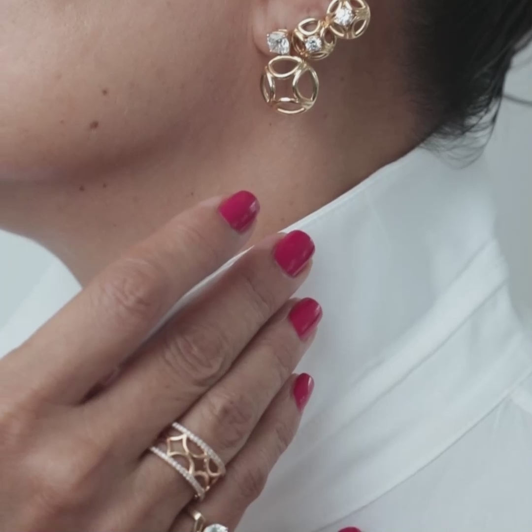 このサーキュラーピアスは、無限の円を通して示される自由へのオマージュです。18K イエローゴールドの曲線とラインがラウンドシェイプを形成し、両耳に輝くラウンドカットのラボグロウンダイヤモンドがそれを引き立てます。
