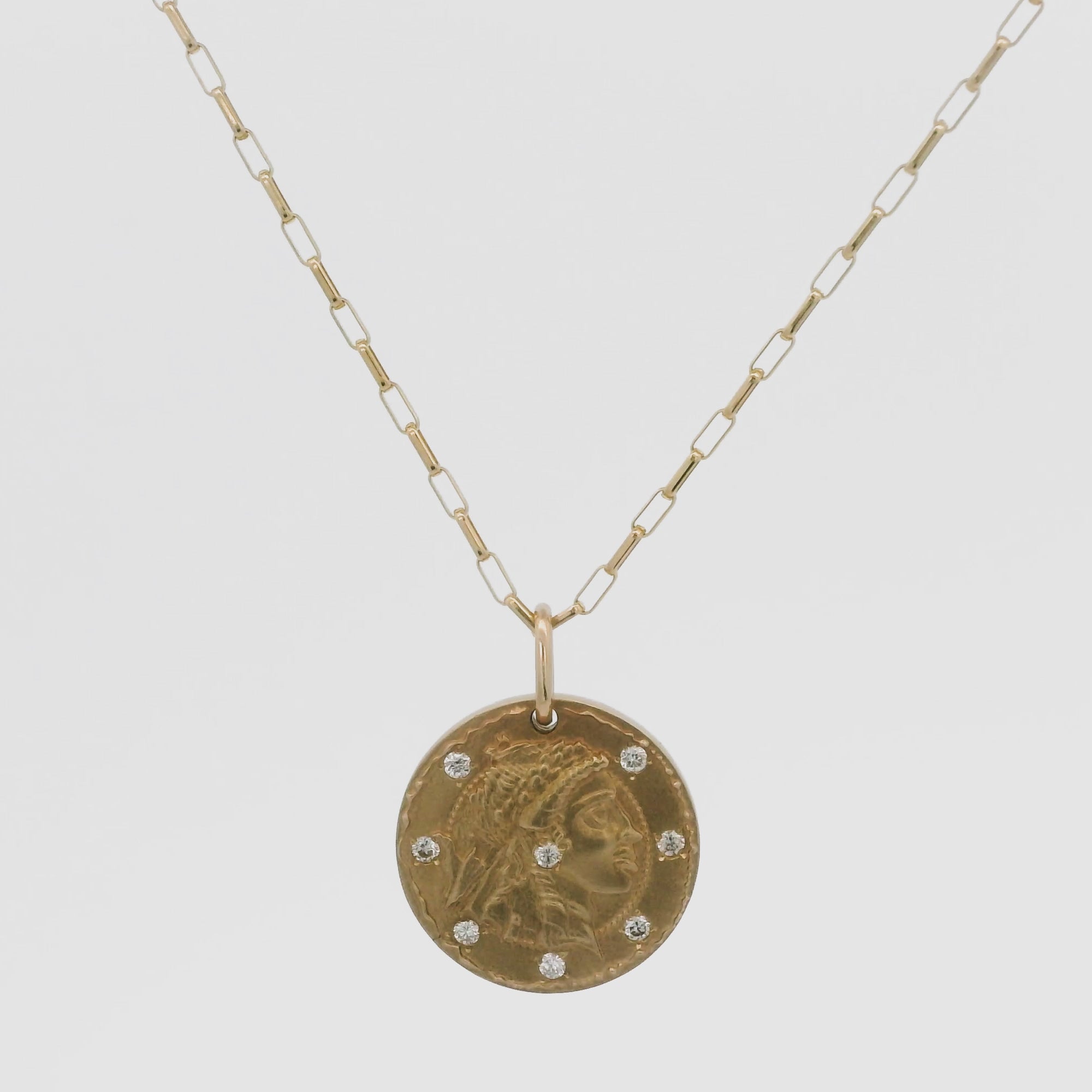 A K10 coin charm depicting Apollo, the god of the sun. Diamonds scattered radiating from the center represent the shining "sun." As he was the god of light, entertainment, and the arts, this charm is perfect for those who wish for their talents to blossom and those who want hope for the future.