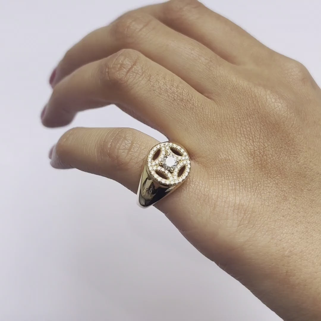 The signature style of this Chevalière ring is a blend of angles and curves, structured and bold.
